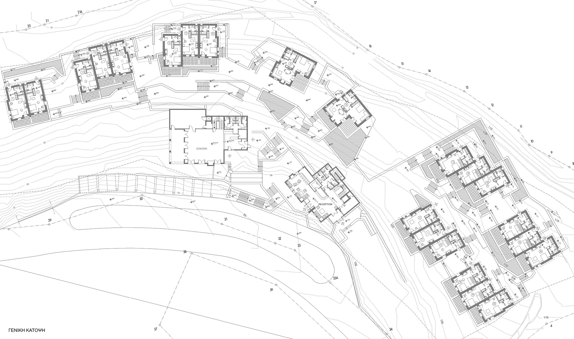 The complex, of 60 beds, is located in a mountainous area in Kalavryta, Achaia, on a steep slope overlooking the village. Archigraph undertook the study, the supervision of construction as well as the interior design, taking into account both the natural landscape and the traditional architecture of the area. The room units are arranged in groups that follow the slope and view and this arrangement organizes the movement within the complex. The restaurant and the reception are also located centrally on the plot.