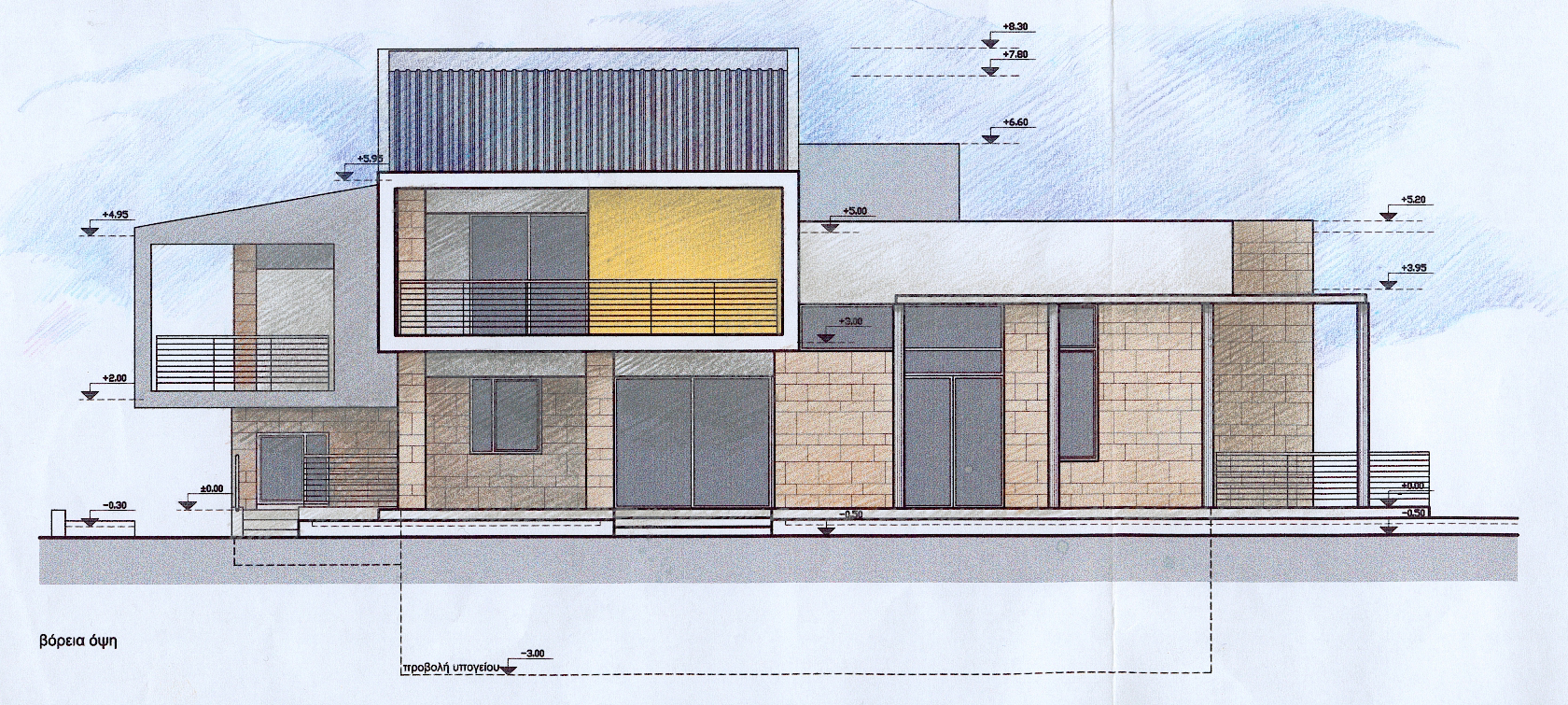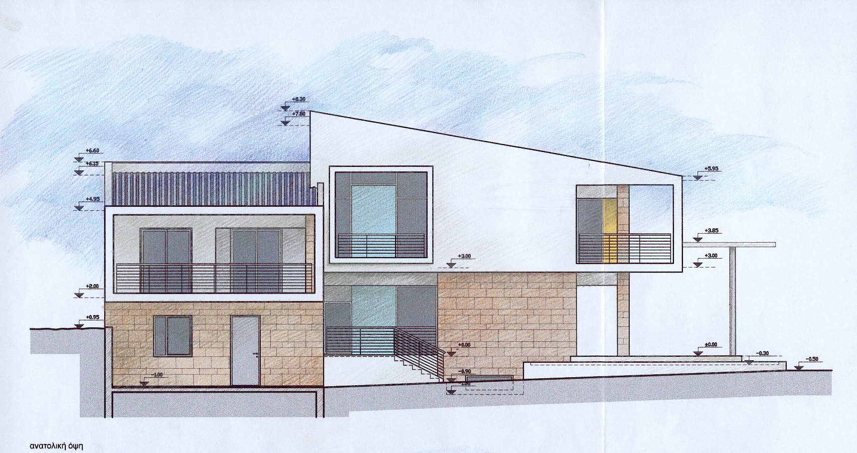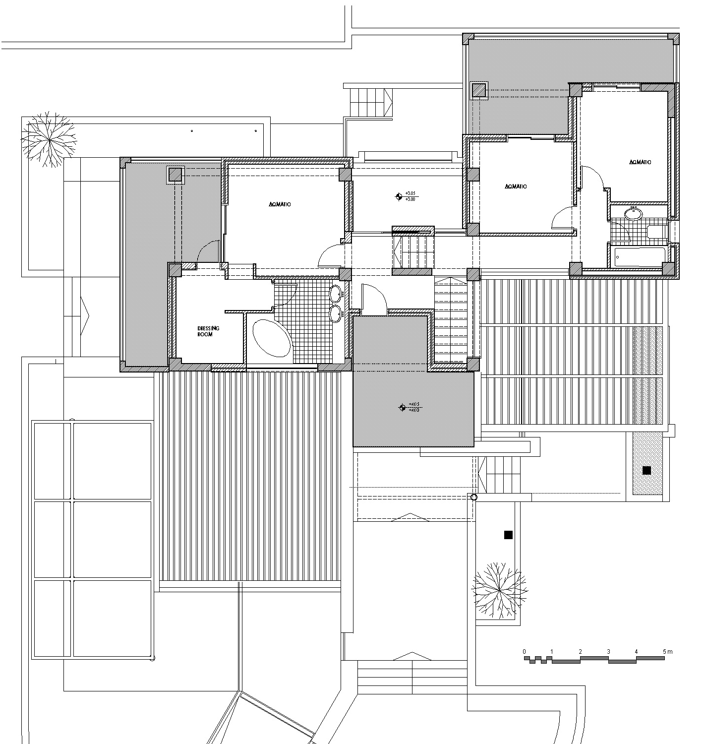 The detached house is organized in three large volumes which are hinged at the center with the lobby, the circulation space and vertical communication space. The ground floor is developed on two levels with little difference in level and includes the entry and the living rooms on the first level and two bedrooms with bathroom on the second one. The first floor contains the main bedroom with the necessary auxiliary spaces. All the main sites expand externally with large semi-outdoor spaces and balconies.