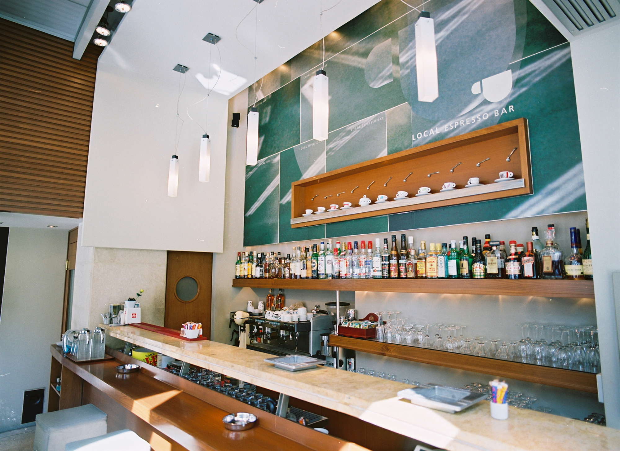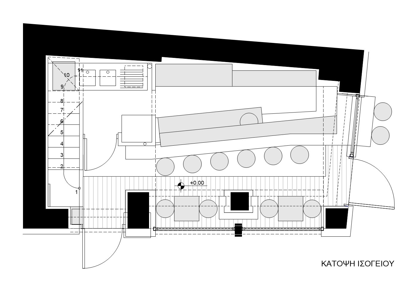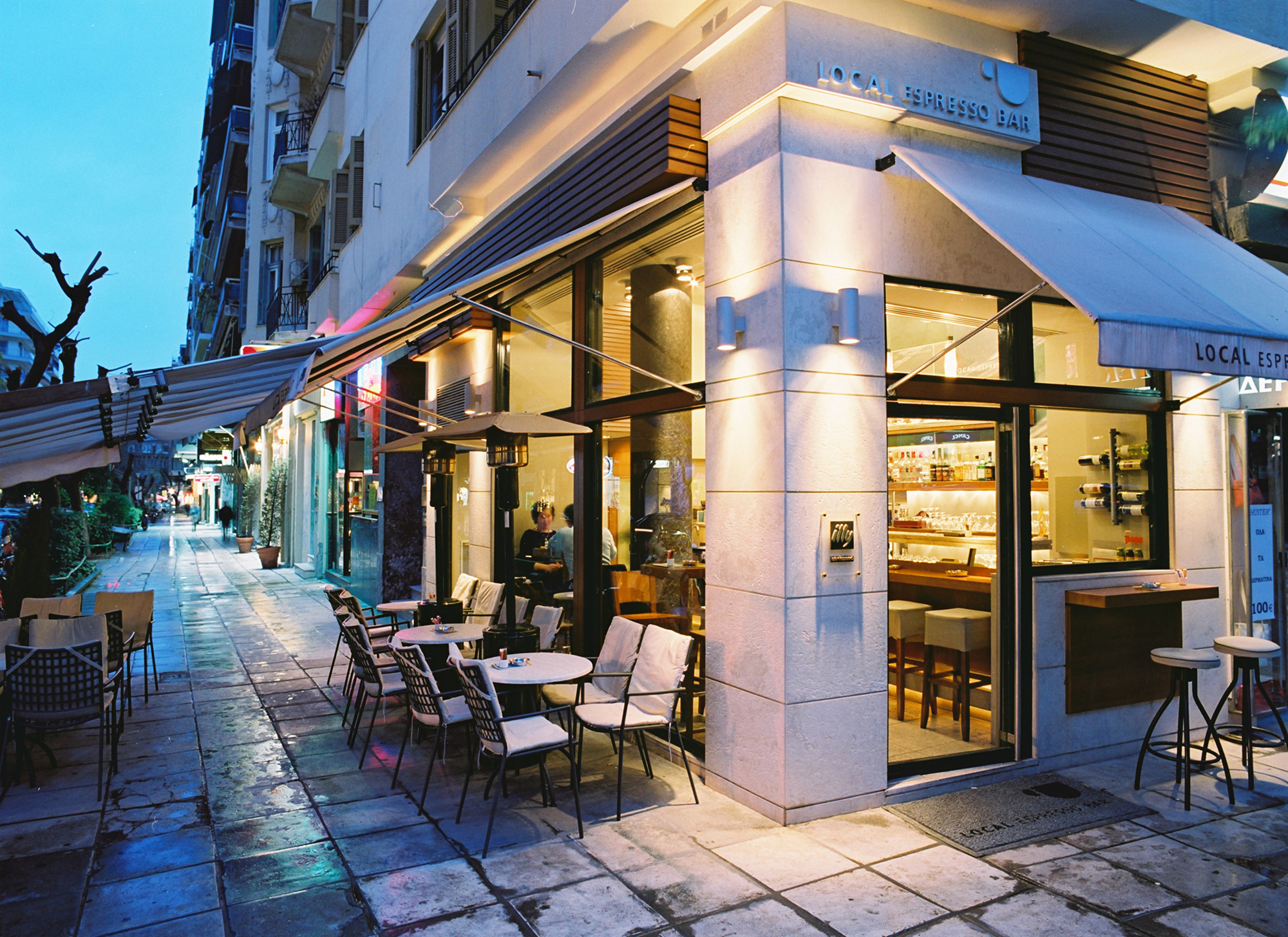 Small cafe, downtown. The small interior communicates directly with the outdoors area and extends itself to the pavement. The bar furniture occupies most of the space and the facades function as a display of this area, with window frames that slide upwards and disappear. The materials used, such as wood and limestone, give a sense of familiarity, which is enhanced by the use of the lighting.