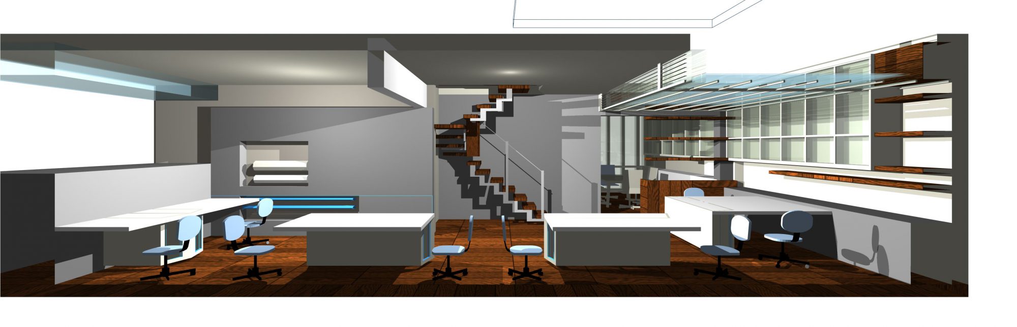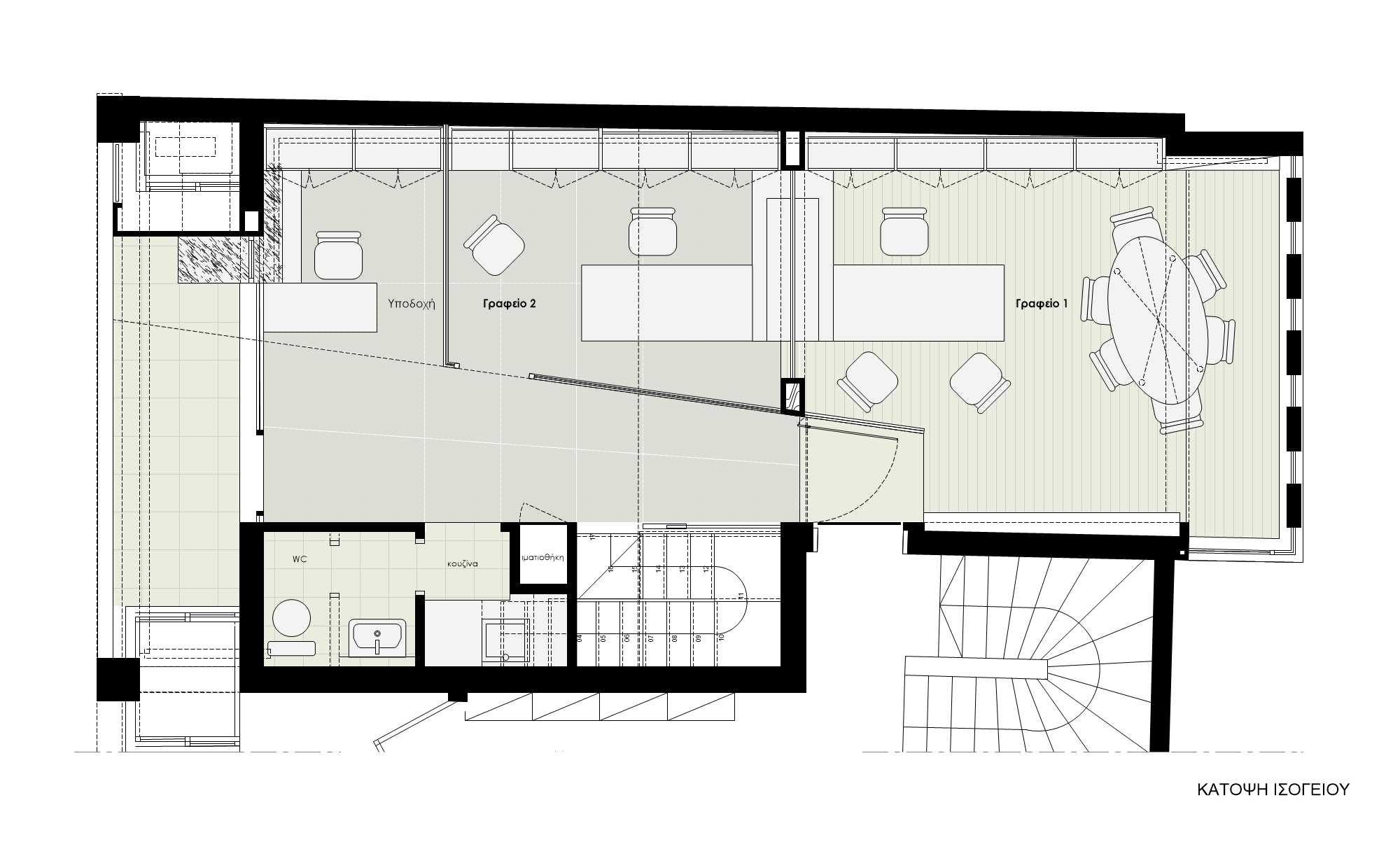 Refurbishment of the office areas of a structural engineers’ company in two levels. The first level houses the reception room, two offices and meeting rooms. On the second level, an open workspace and auxiliary spaces are located.