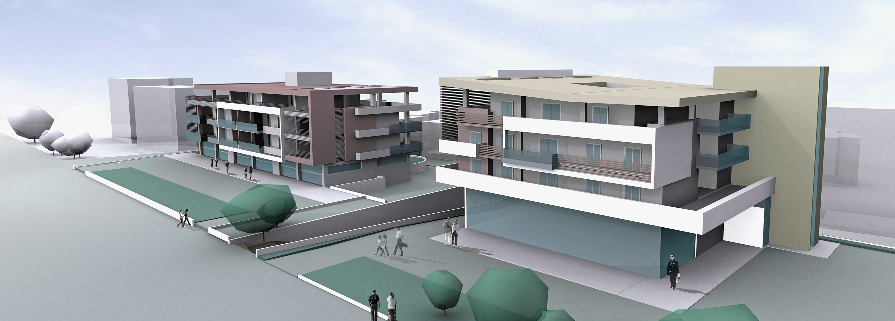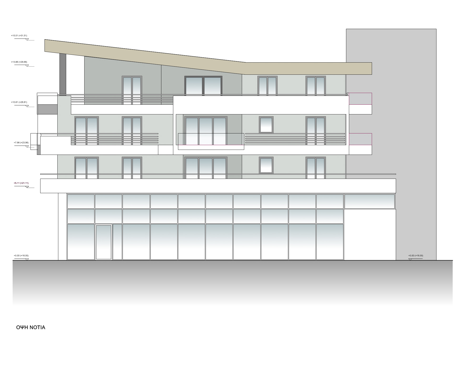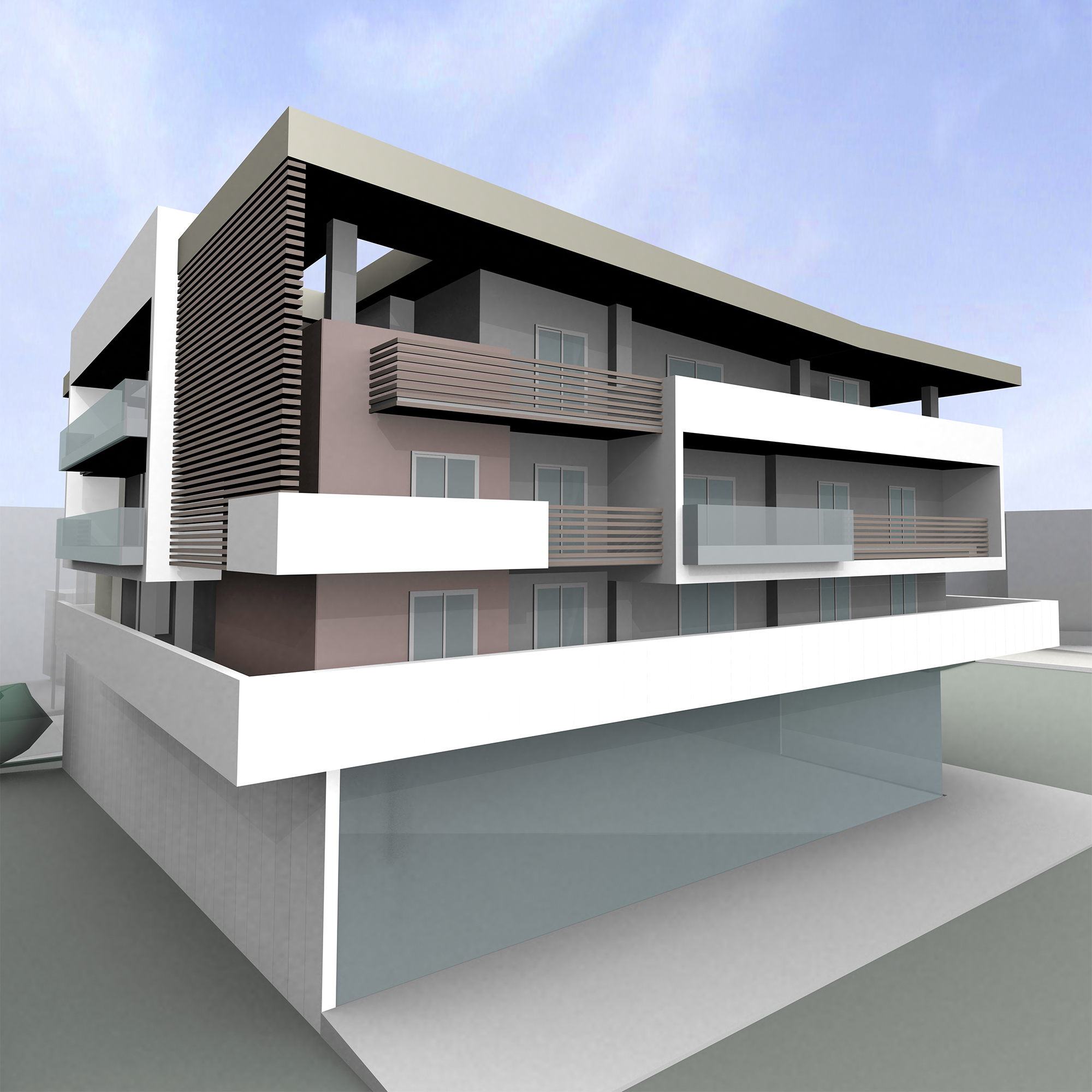 The building houses a hypermarket on the ground floor, which occupies the maximum allowable coverage of 690 m2. It has three floors of residential apartments with fifteen apartments in total, each of which has an area of about 90 m2. The building has a steel frame following a challenging structural design with columns only around the perimeter, leaving the entire area of the ground floor free of obstacles.