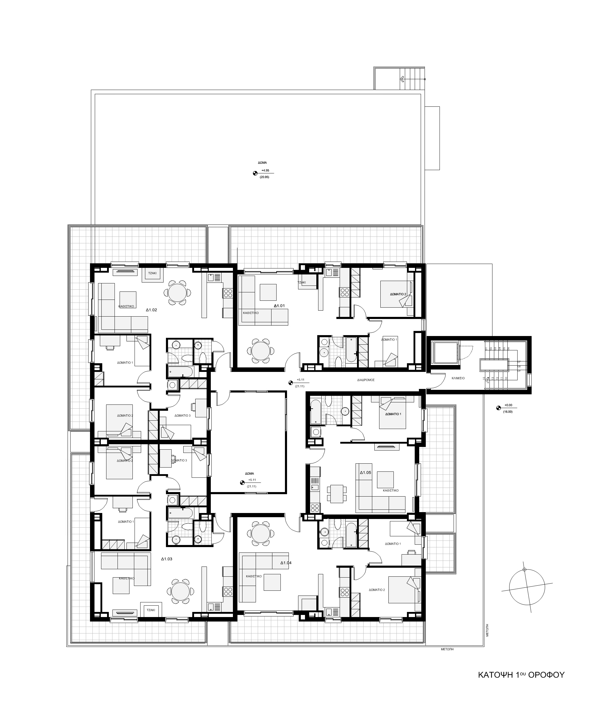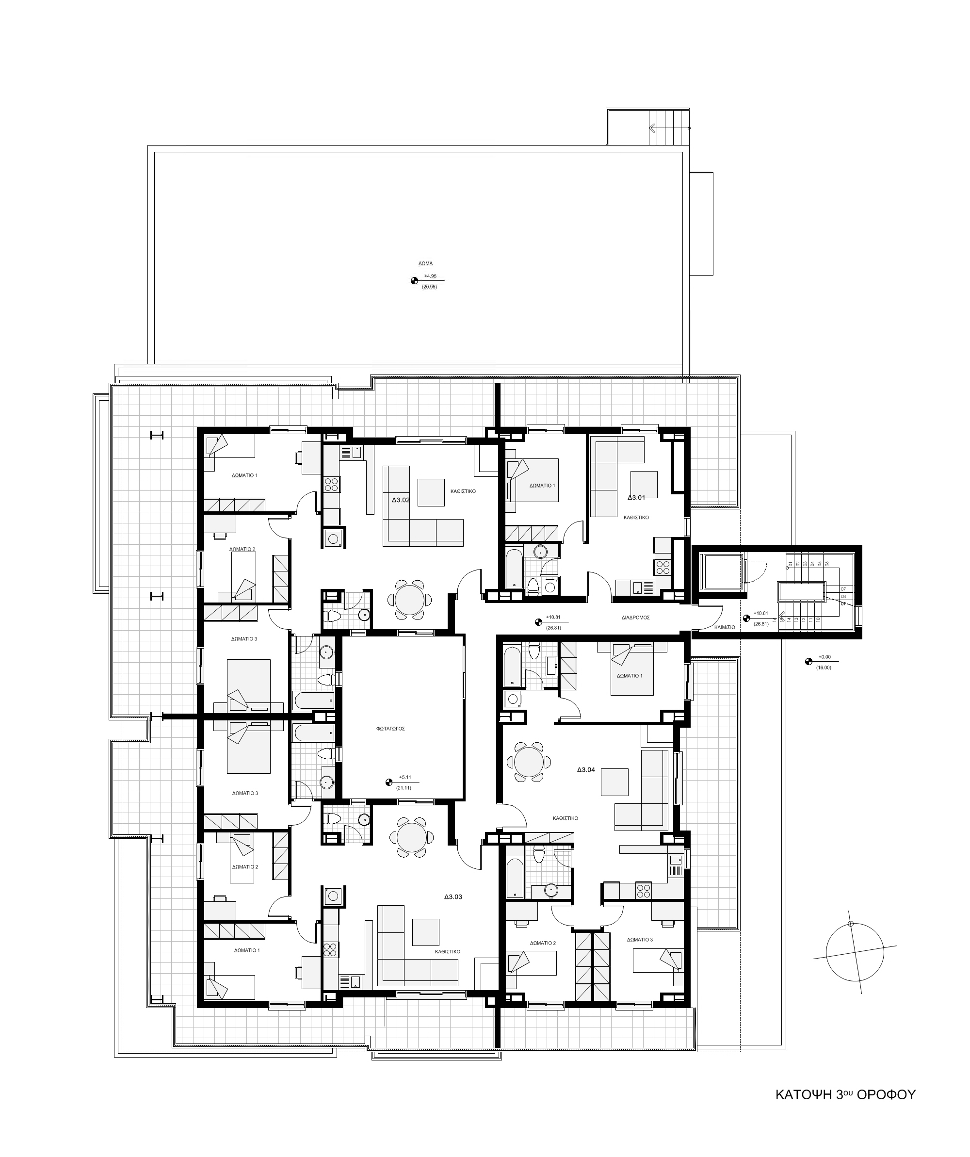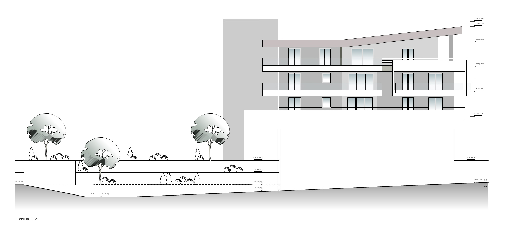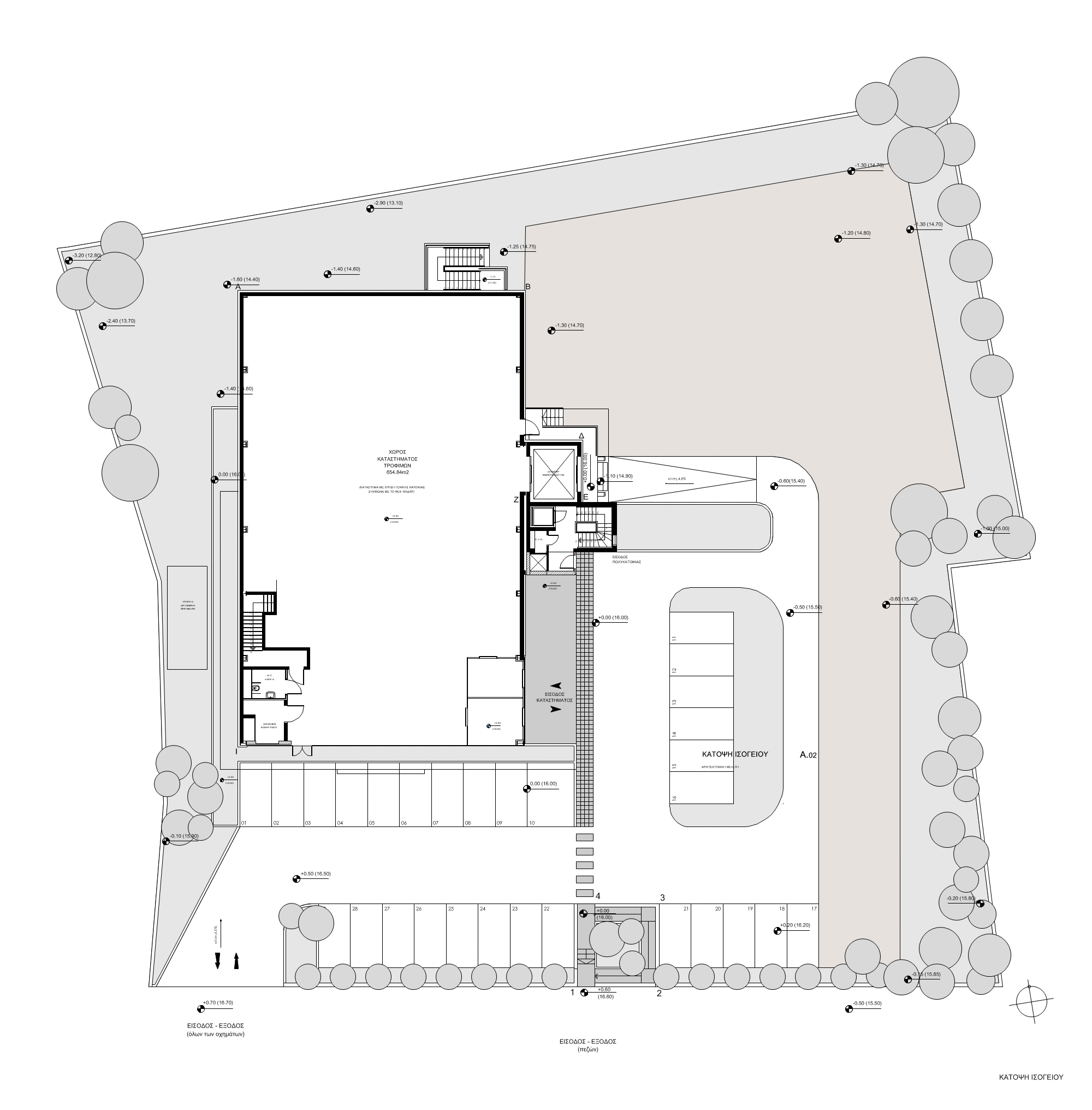 The building houses a hypermarket on the ground floor, which occupies the maximum allowable coverage of 690 m2. It has three floors of residential apartments with fifteen apartments in total, each of which has an area of about 90 m2. The building has a steel frame following a challenging structural design with columns only around the perimeter, leaving the entire area of the ground floor free of obstacles.