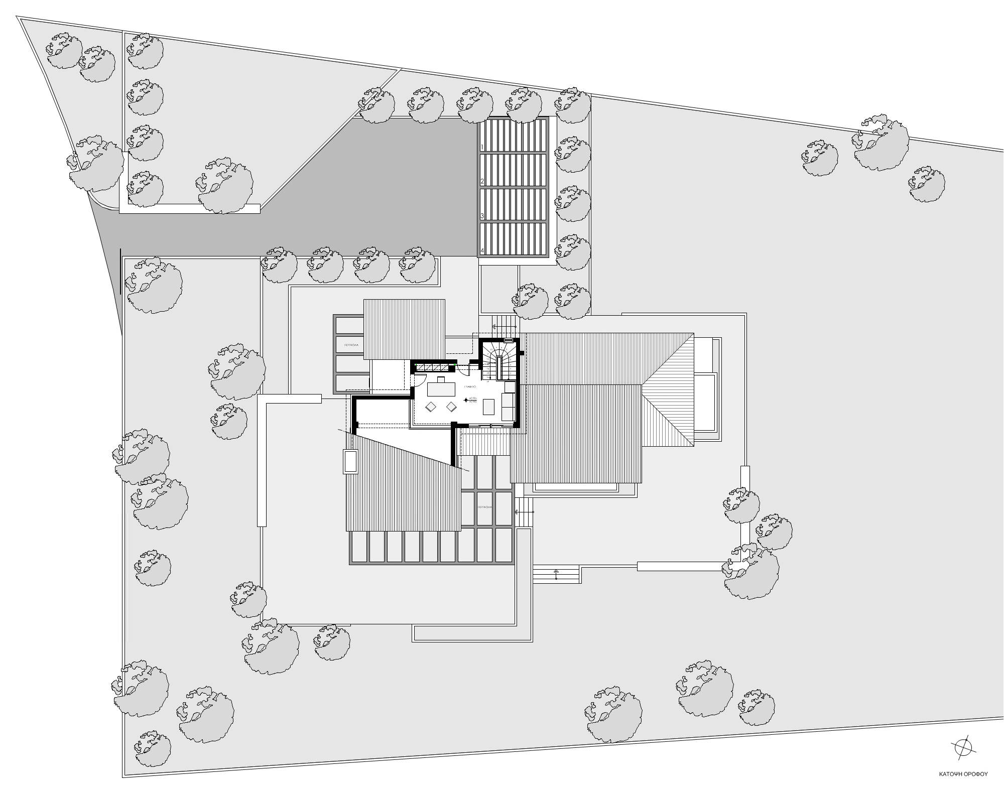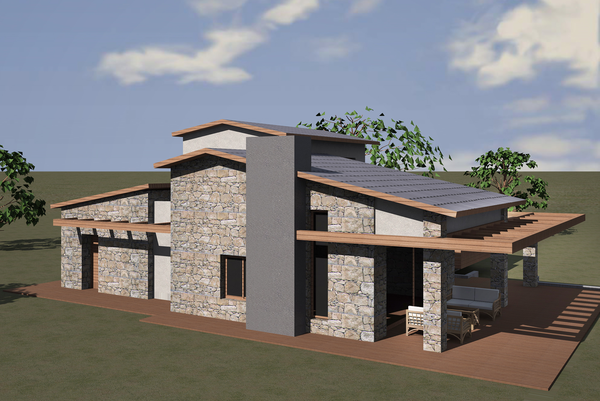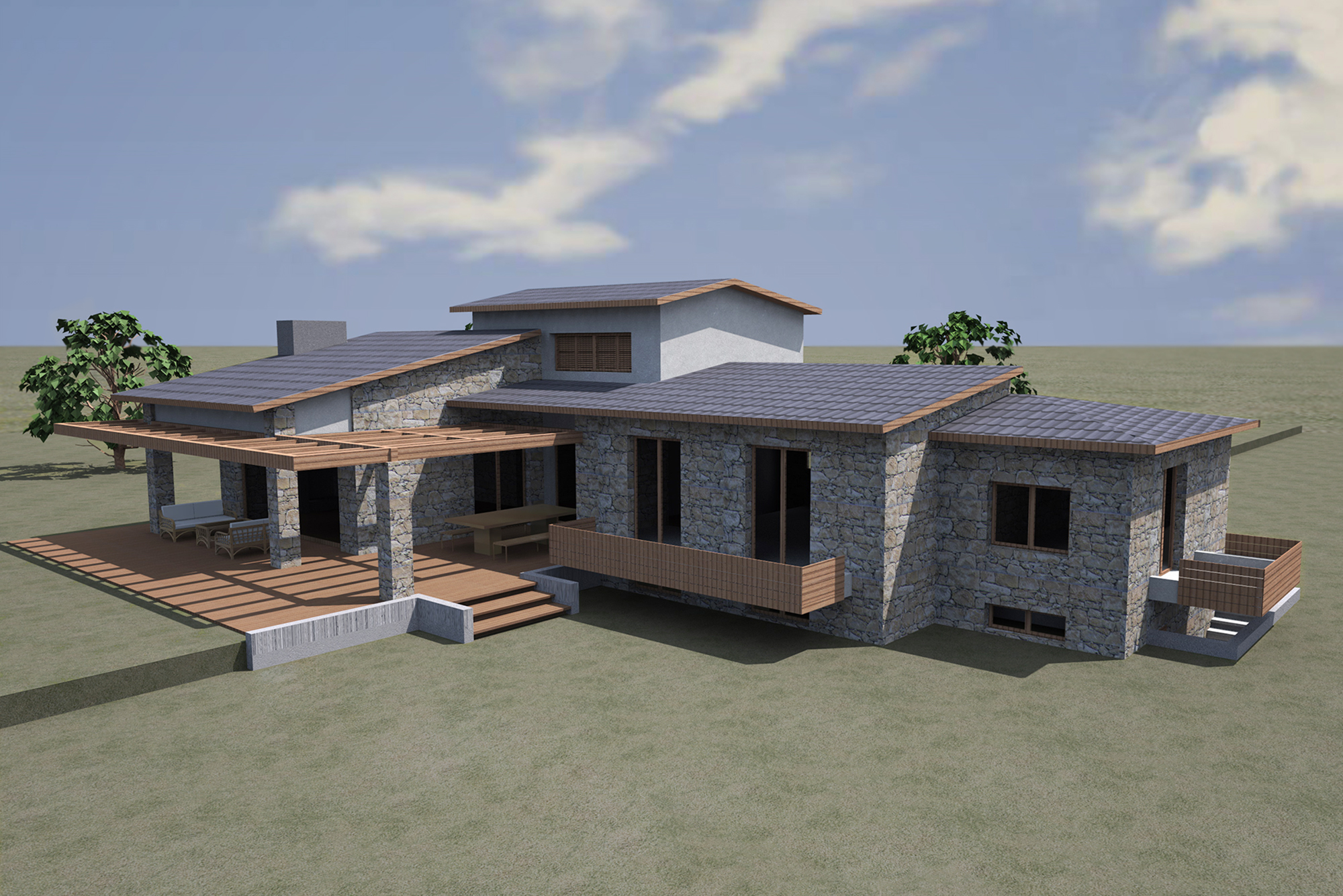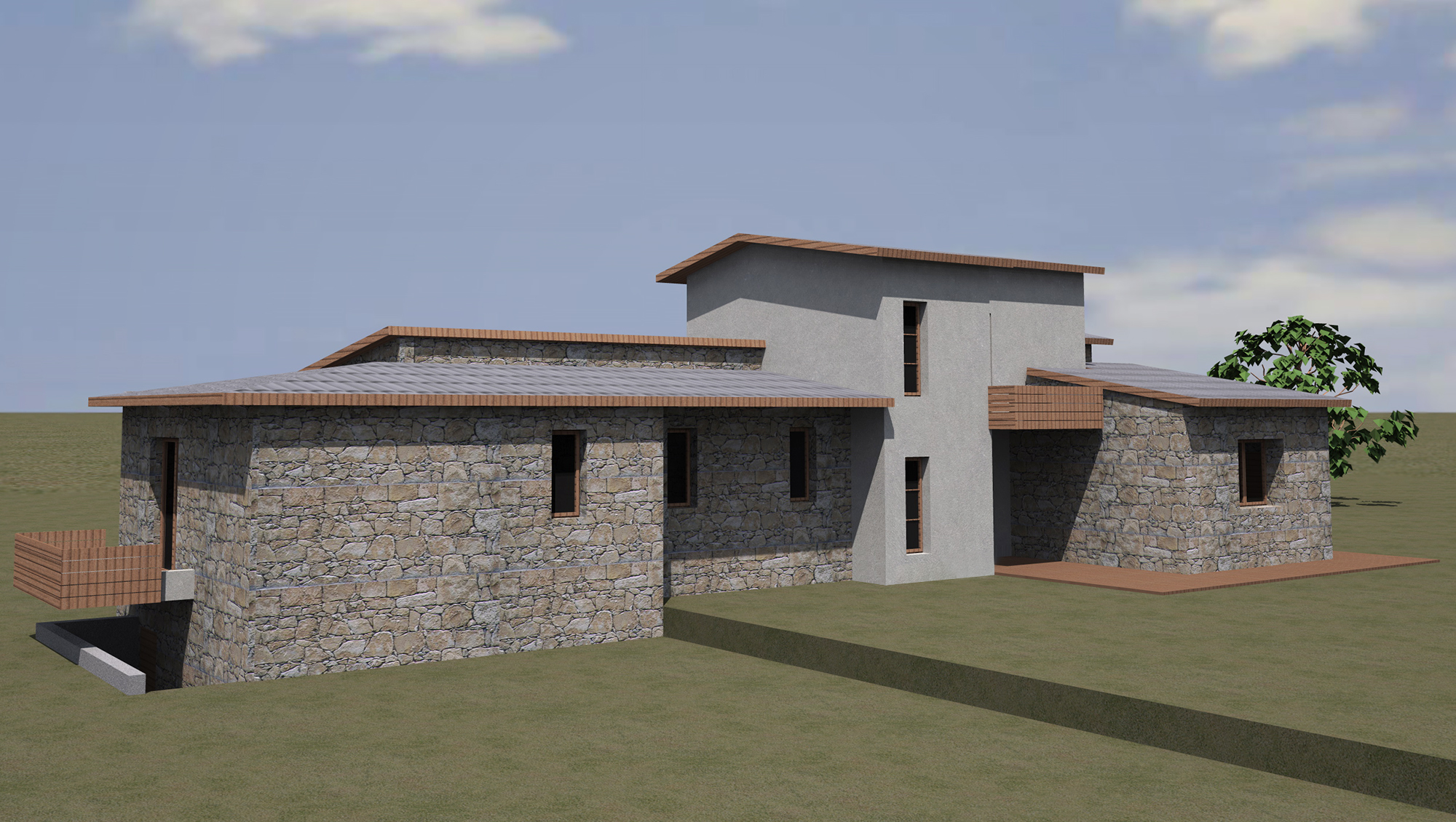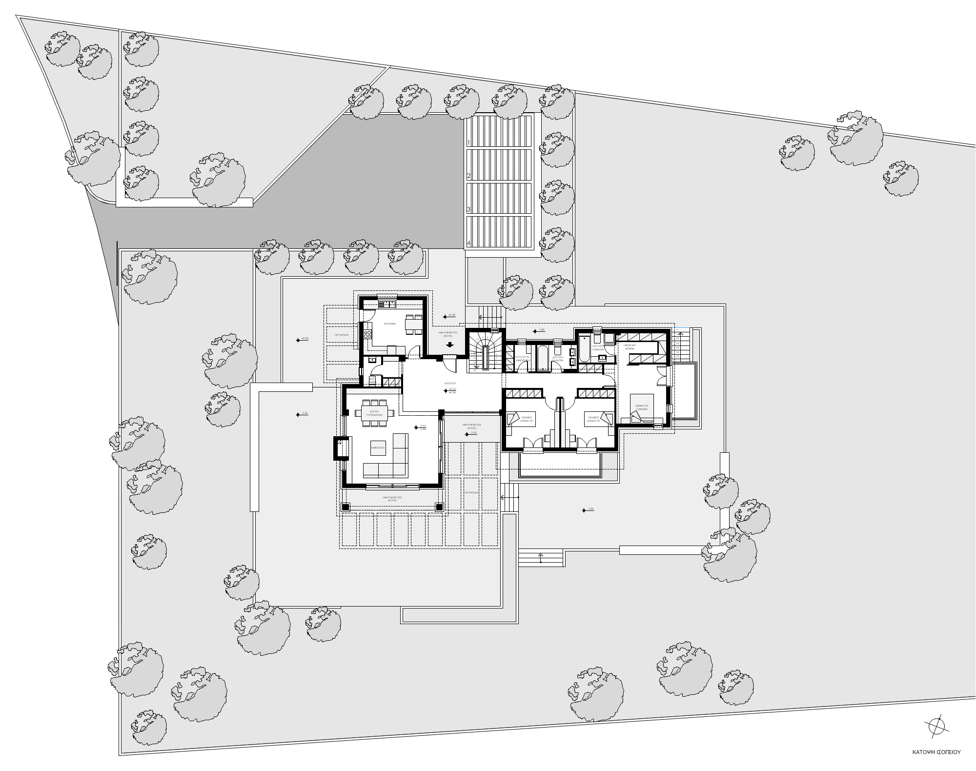 This is a single storeyed stone residence with a small piece of floor and basement. The space of entrance functions as a hinge on the functional organization of the house, clearly separating the private from the public areas and introducing visually the open space within the dwelling. All the main living rooms and bedrooms have large openings to the south, while on the north side are placed the auxiliary functions with small openings. On the floor, an open office area is situated, which overlooks the sitting room. Overall, the ground floor has an area of about 200 sq.m., while the floor has one of 30 sq.m.