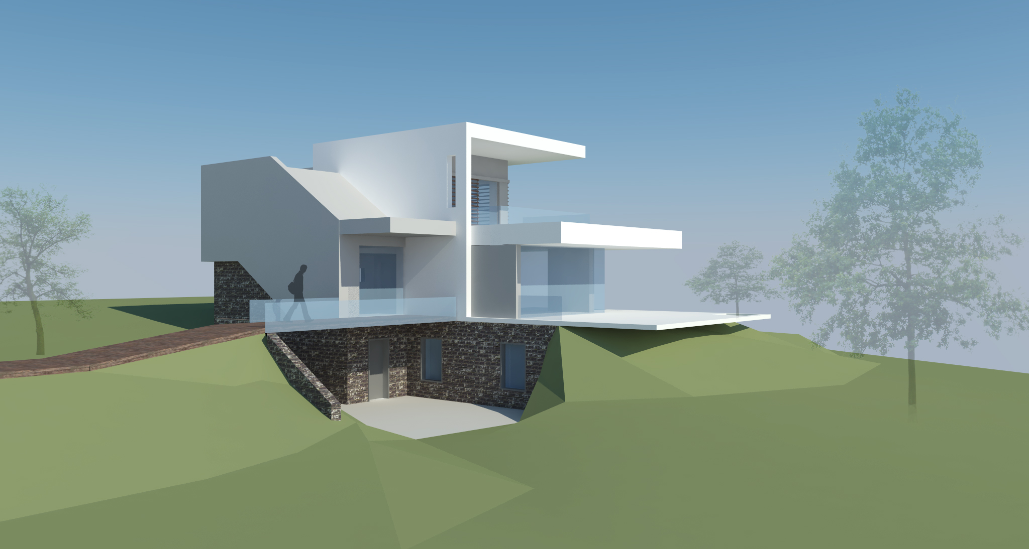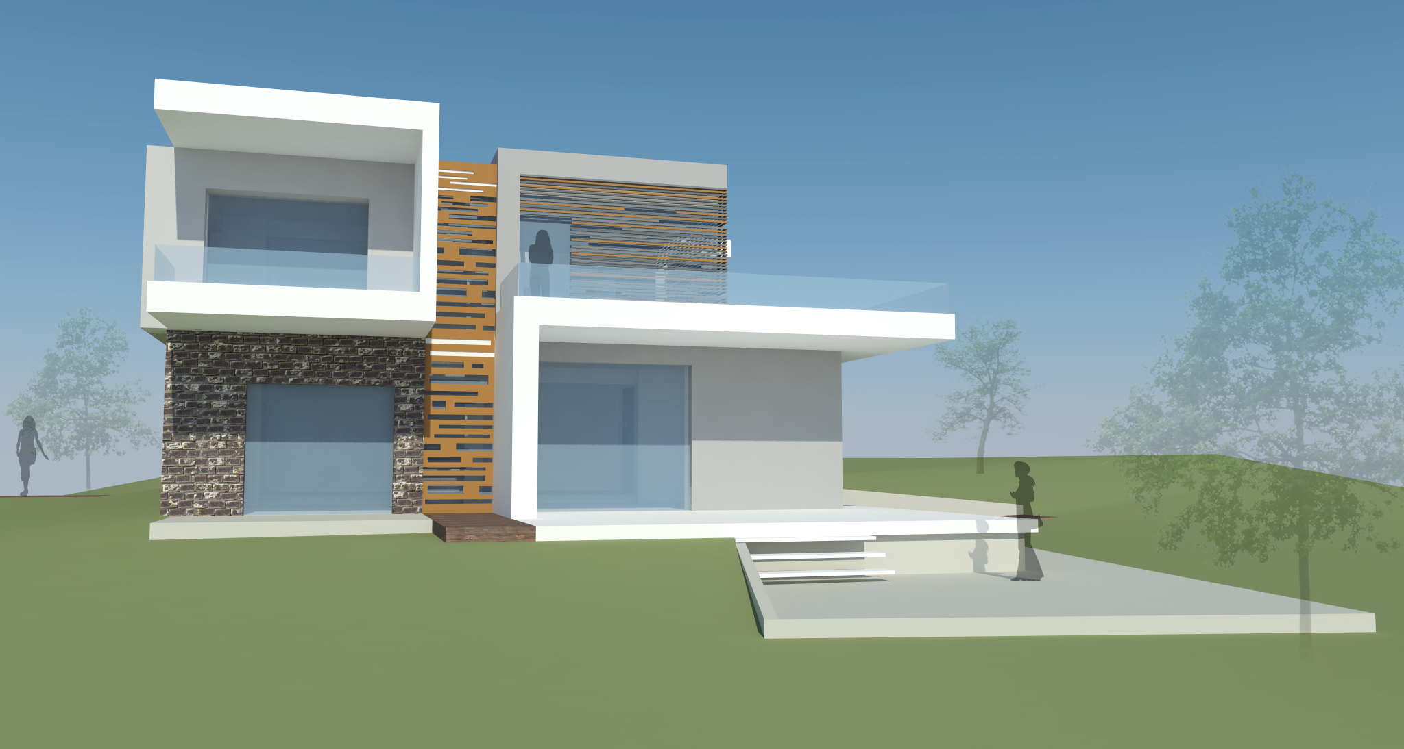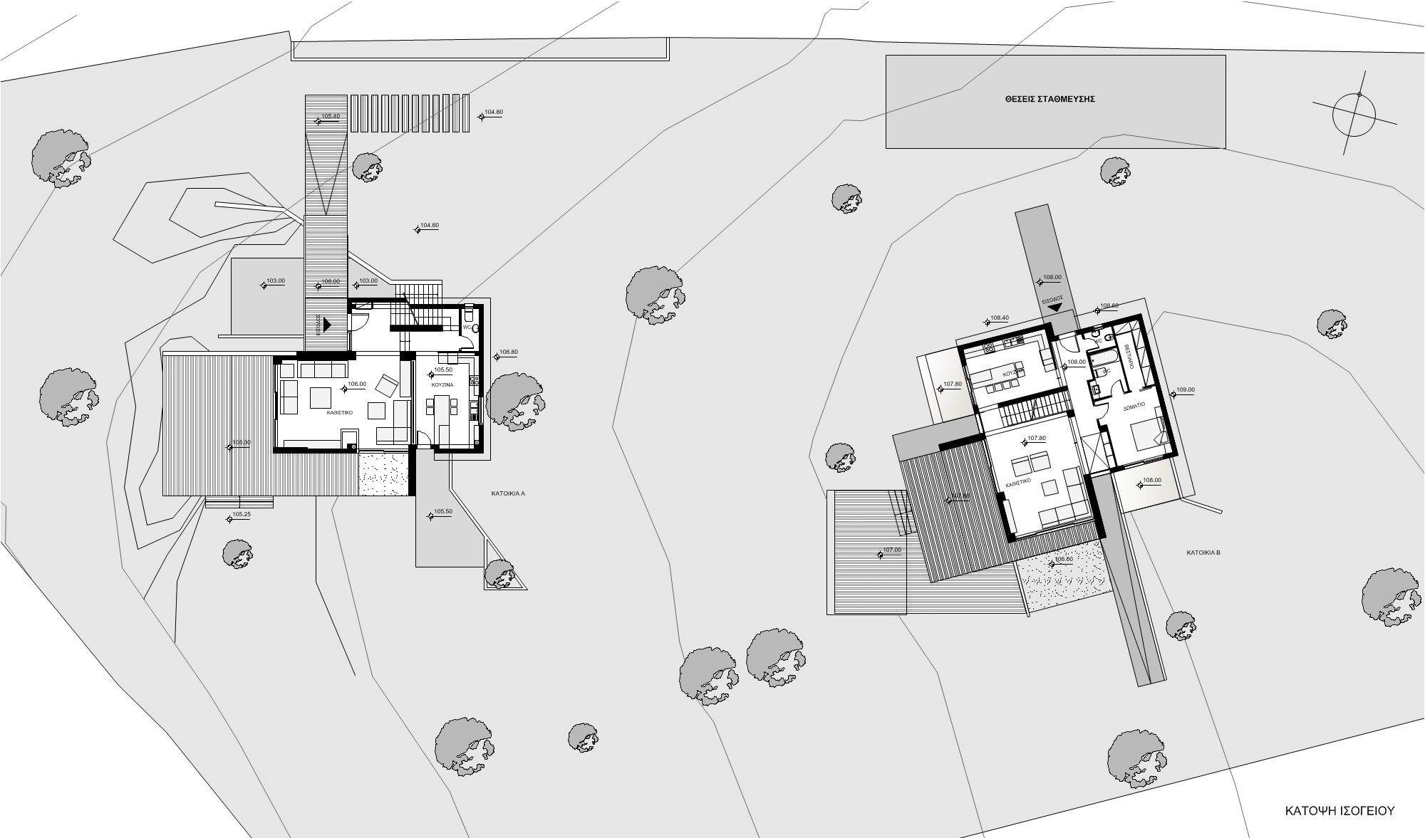 Bi-level residential complex covering a total area of 430 sq.m. The two houses are composed with the same functional organization, with the living rooms on the ground floor, at different levels, bedrooms on the first floor as well as the ancillary areas at the basement level. The same logic is followed in their morphology with axis, the simplicity and the integration in the landscape.