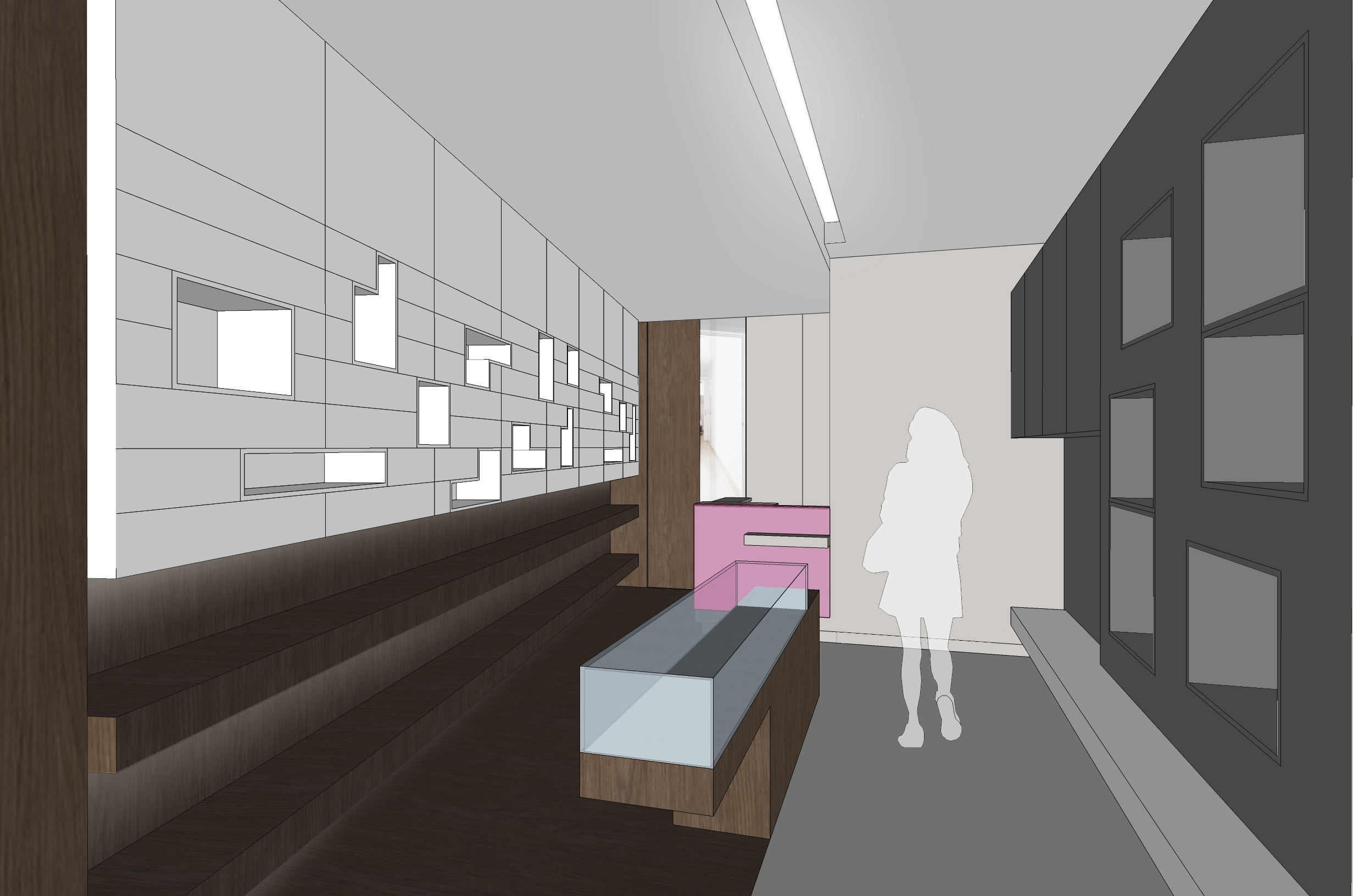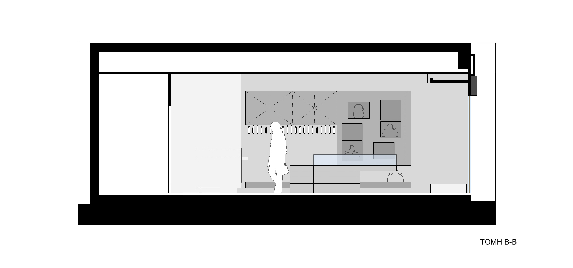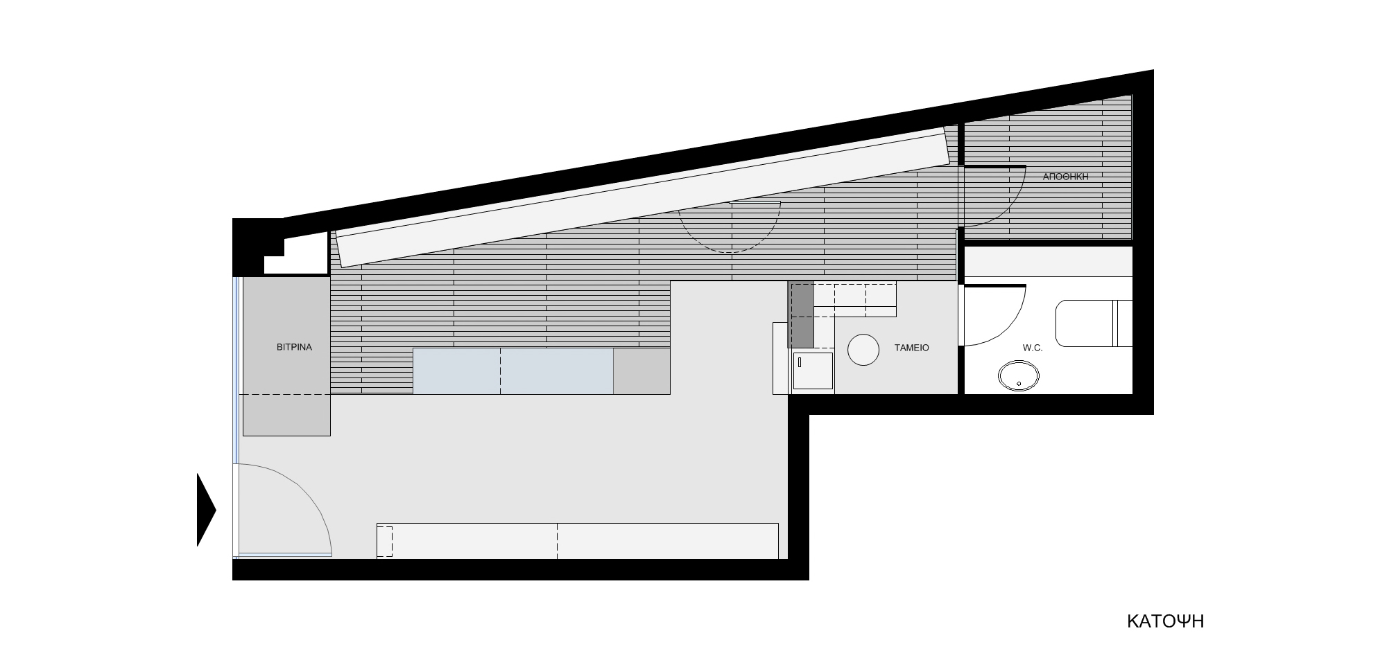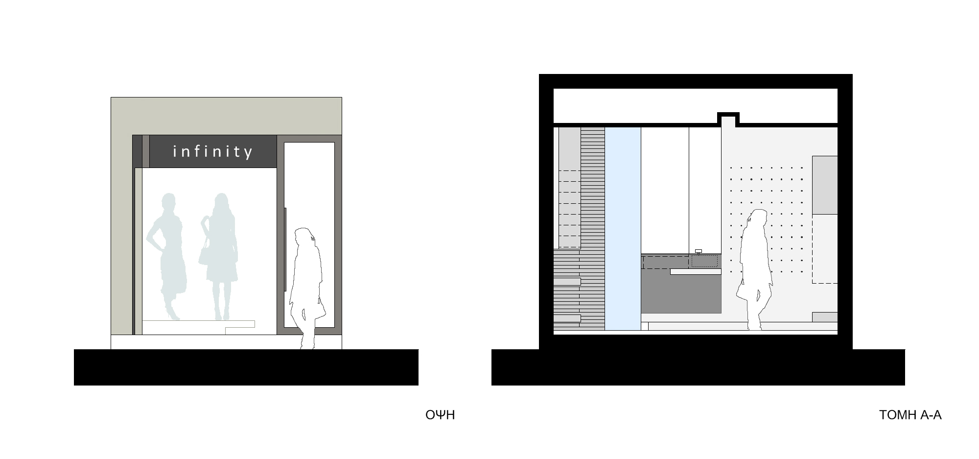 This clothing and accessories store is located on a street vertical to Ethnikis Antistasis pedestrian zone in Peristeri. The display and storage of the products takes place in three large multifunctional furniture with showcases, space for hanging clothes and storage areas. Two of these are developed along the walls of the store and the third one stands in the middle of it, organizing the movement around the space.