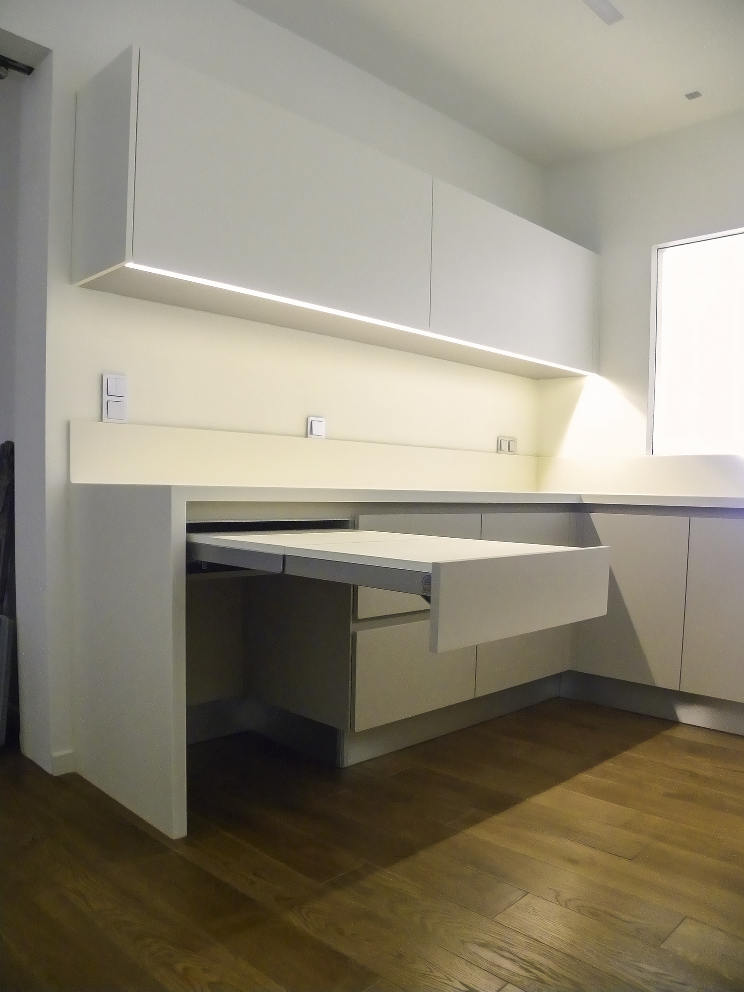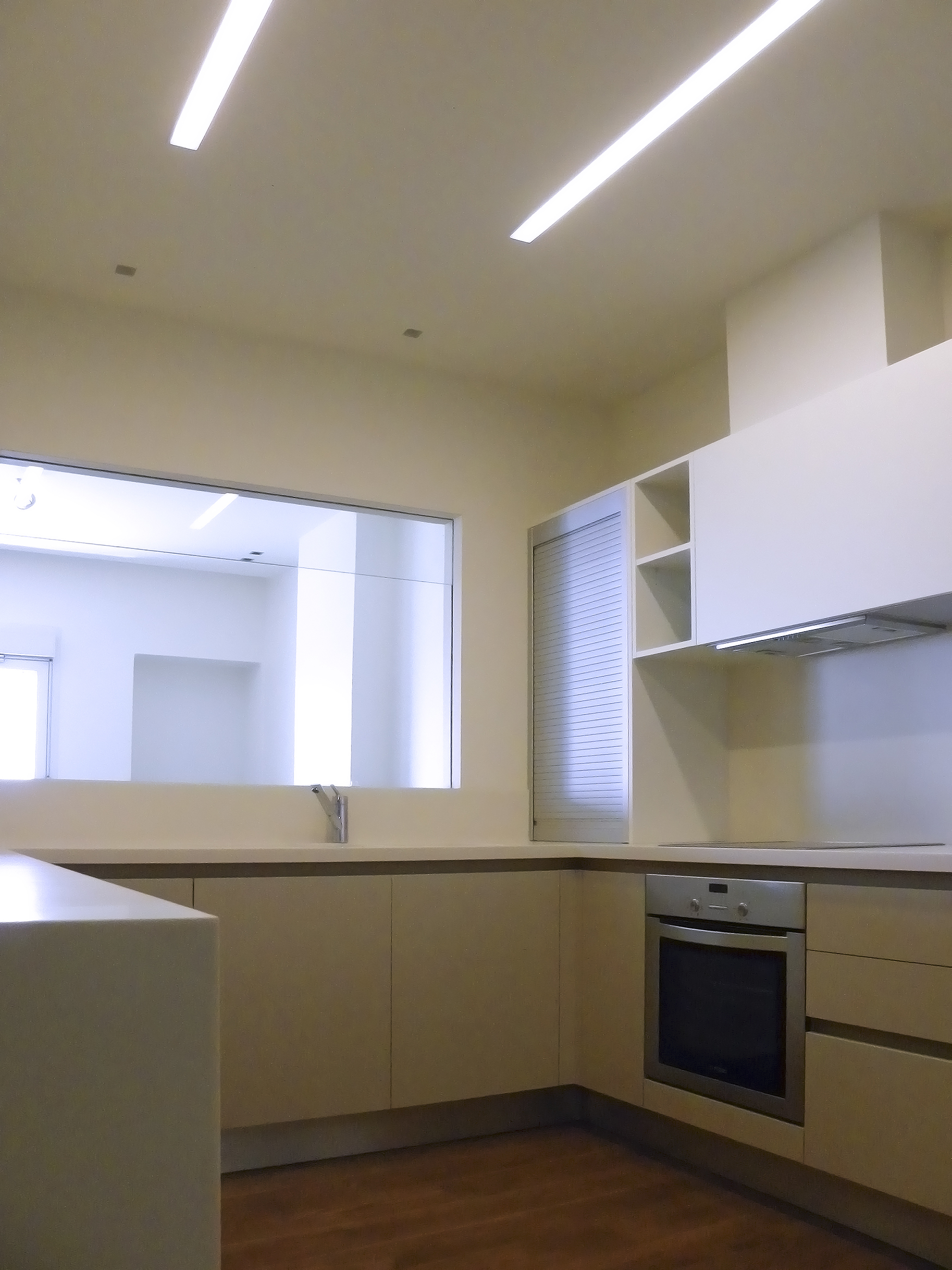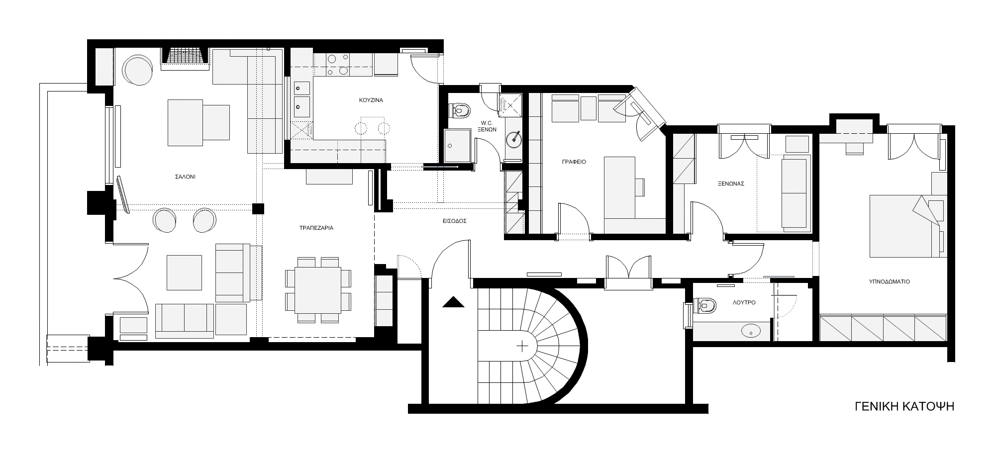The apartment is part of a building, built in 1954, at Thessaloniki’s old waterfront, on Nikis Avenue. It has been completely renovated, both in its layout and its aesthetic, as well as the electromechanical installations. The kitchen area is indirectly illuminated from the living room through a single-hung window, which acts as a unifying or separating element between them, depending on the owners’ preference. Special attention was given to the preservation of the old wooden herringbone parquet.