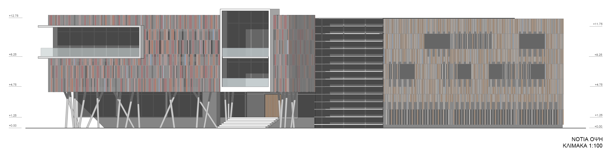 The building consists of two distinct volumes, the first of the administration spaces and the second of the office spaces. They are consolidated through an extensive internal atrium. The arrangement of the volumes allows the orientation of the main spaces to the south. The atrium that forms the core of the building is also oriented to the south, allowing the penetration of the outdoor space and the greenery into the interior of the building. The elevation of one of the two volumes enhances this relationship of the building with the outdoor space. The entrance is located in the elevated part and is shaped in such a way that the visitor perceives most of the interior through the atrium.