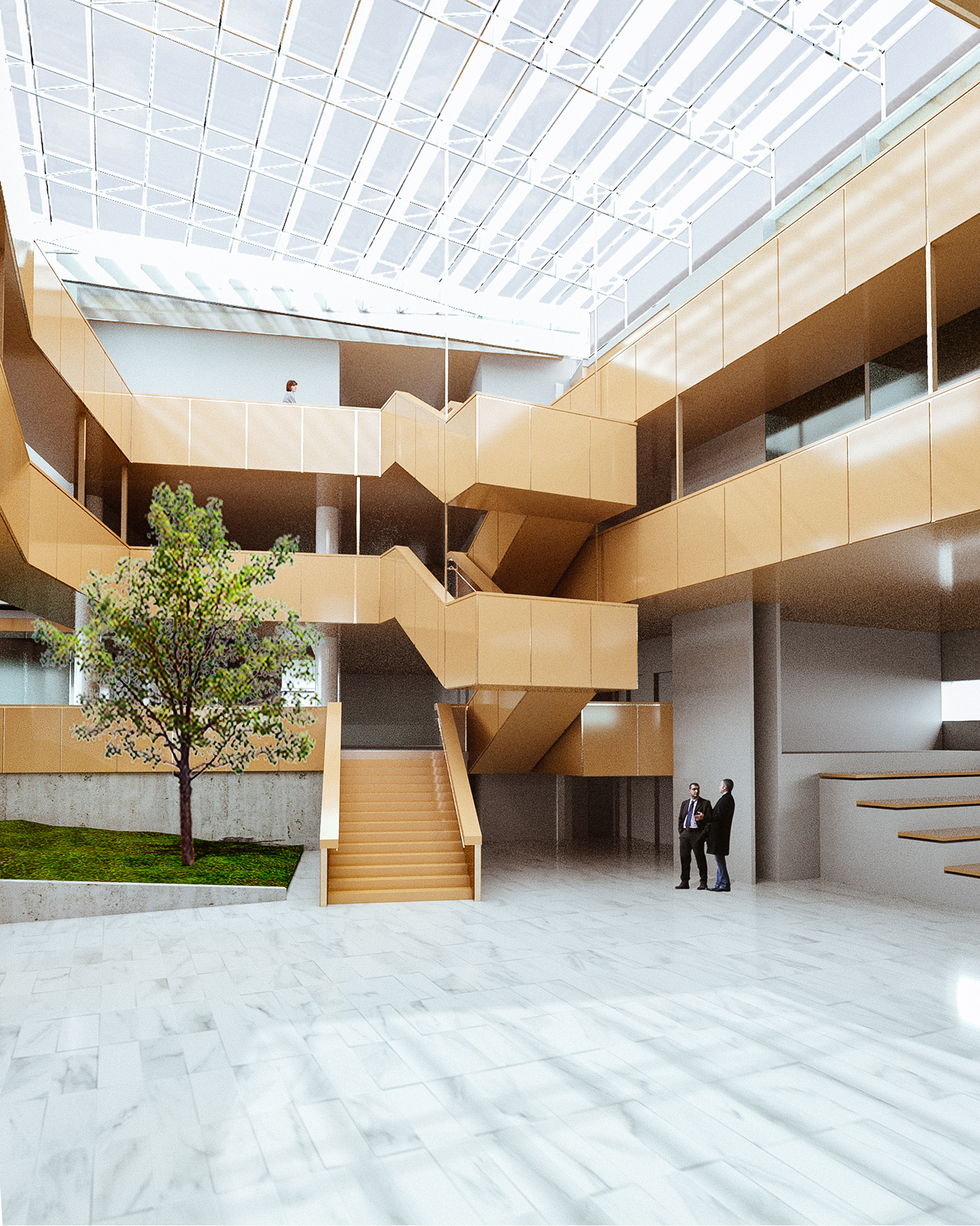 At the entrance level are located the main reception, from where the movements are distributed, and the meeting rooms. At the level of the double-heighted atrium are located the event and dining rooms which could be extended on a case-by-case basis to the atrium, composing a large event space. At the 1st and 2nd floor there are offices and conference rooms. The circulation inside the building takes place through a central staircase inside the atrium and corridors around it.