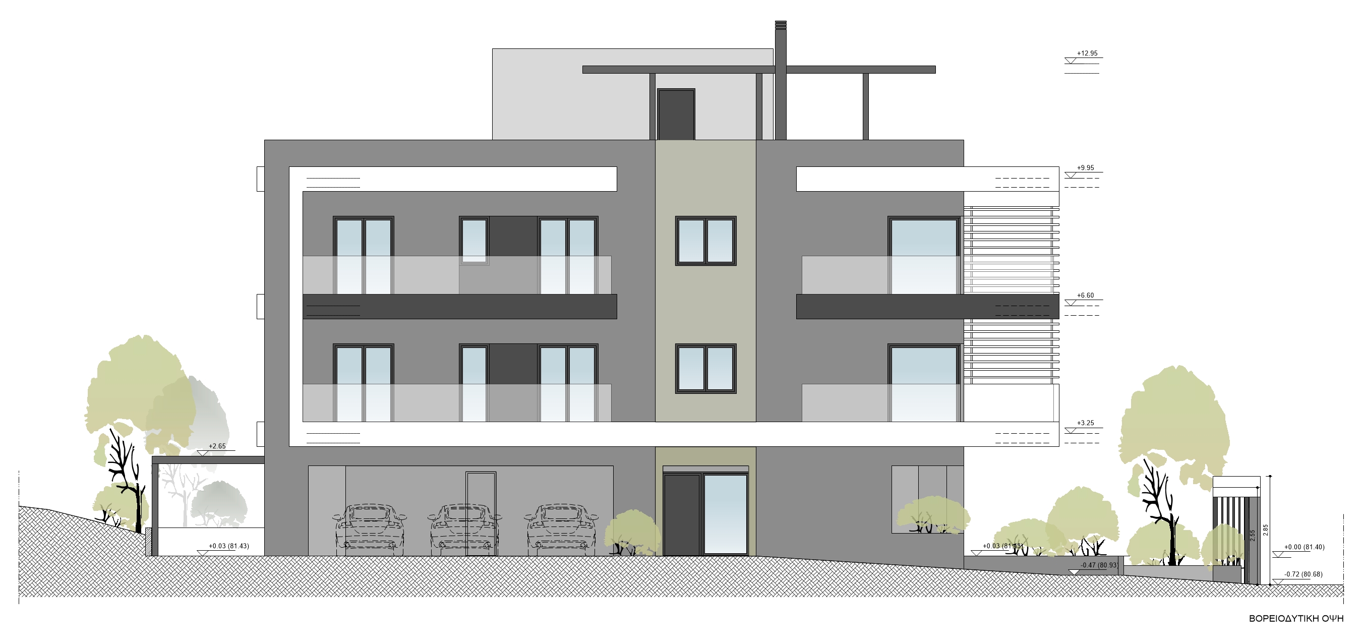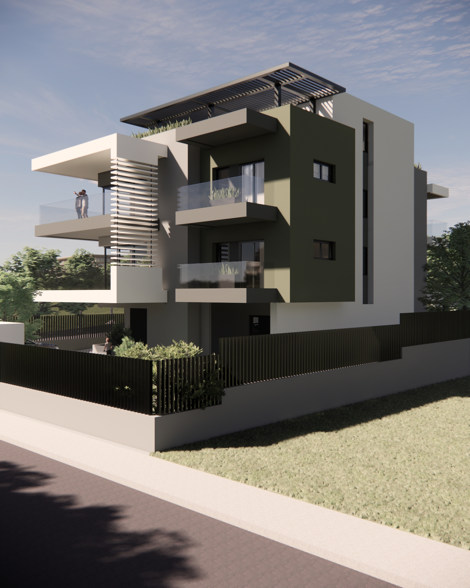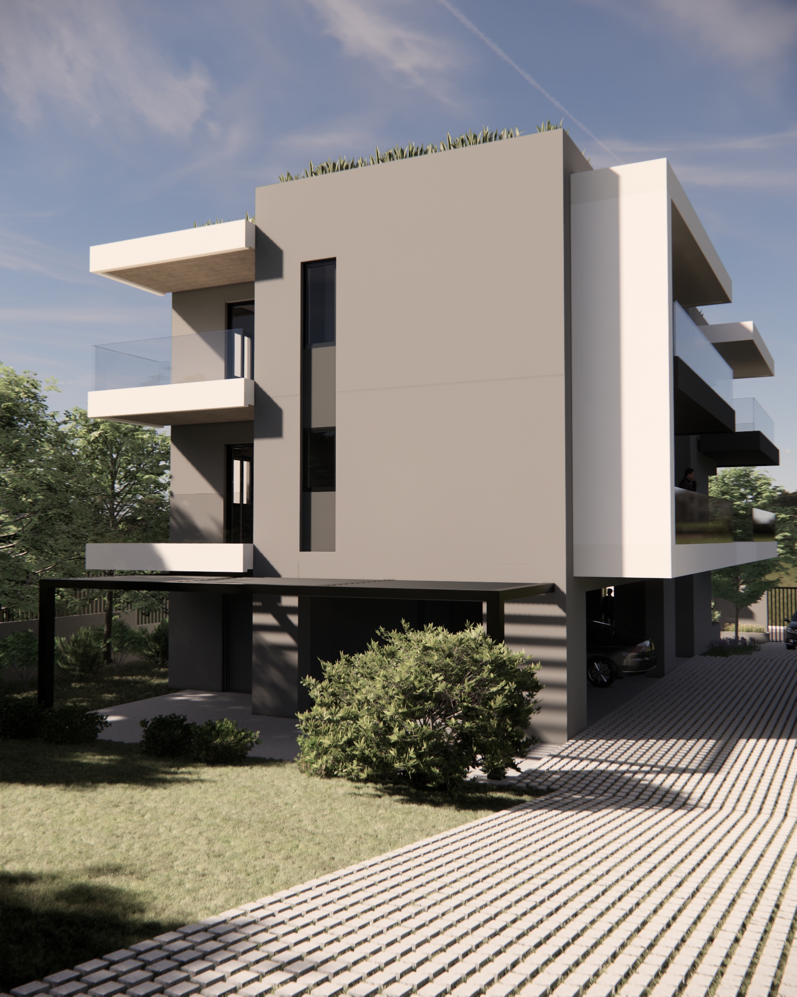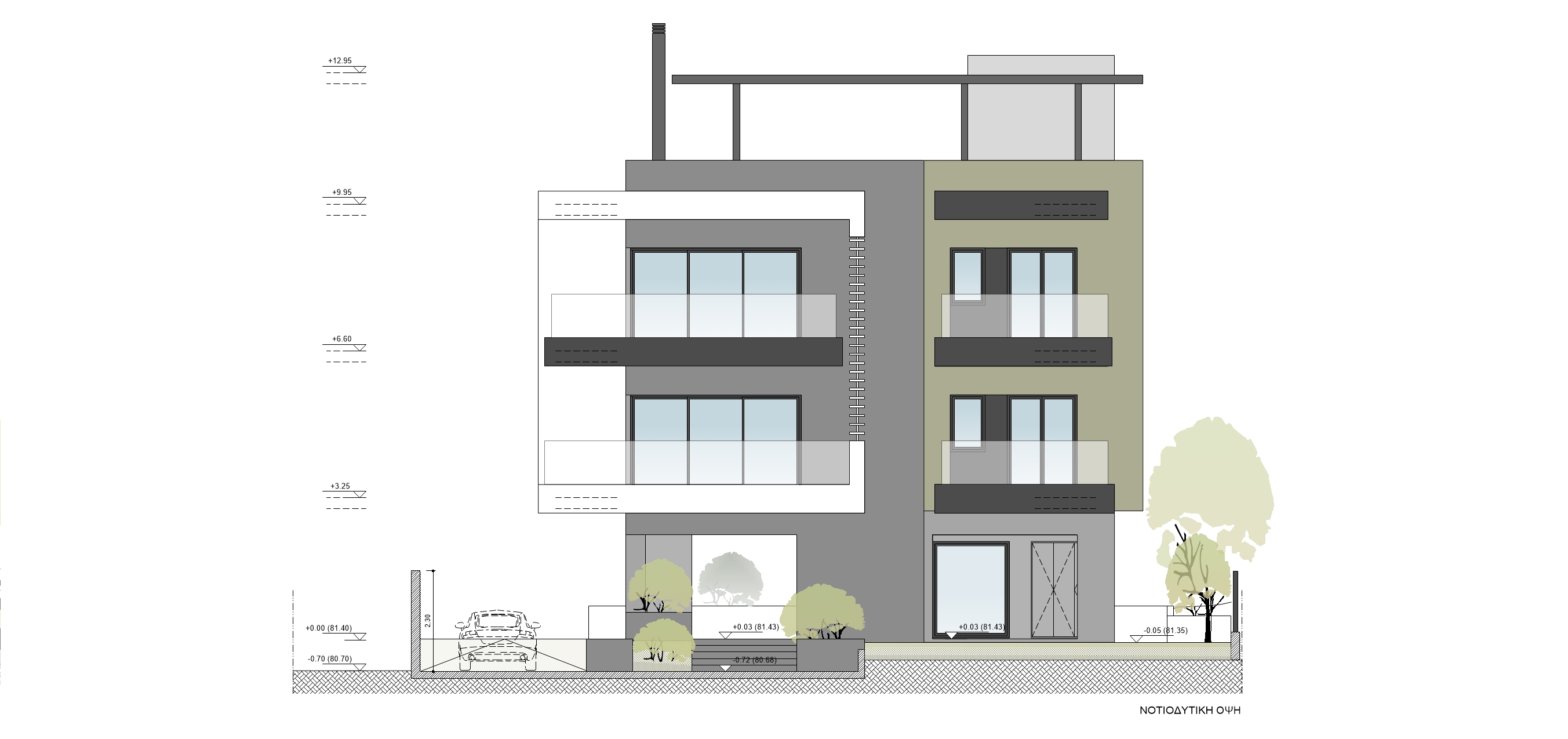 Το κτίριο τοποθετείται κεντρικά σε οικόπεδο εμβαδού 550 τ.μ. και αναπτύσσεται σε τρία επίπεδα. Το ισόγειο διαμορφώνεται ως pilotis με την κεντρική είσοδο και χώρους στάθμευσης οχημάτων. Στον πρώτο και δεύτερο όροφο χωροθετούνται συνολικά τρία διαμερίσματα. Στον πρώτο όροφο βρίσκονται τα δύο διαμερίσματα με επιφάνειες περίπου 80.00 τ.μ. ενώ στο δεύτερο όροφο βρίσκεται ένα οροφοδιαμέρισμα συνολικής επιφάνειας περίπου 160.00 τ.μ. Το κοινόχρηστο κλιμακοστάσιο καταλήγει σε βατό δώμα του κτιρίου όπου κατασκευάζεται μεταλλική πέργκολα και διαμορφώνεται χώρος υπαίθριου καθιστικού με οπτική φυγή στη θέα του Ολύμπου.