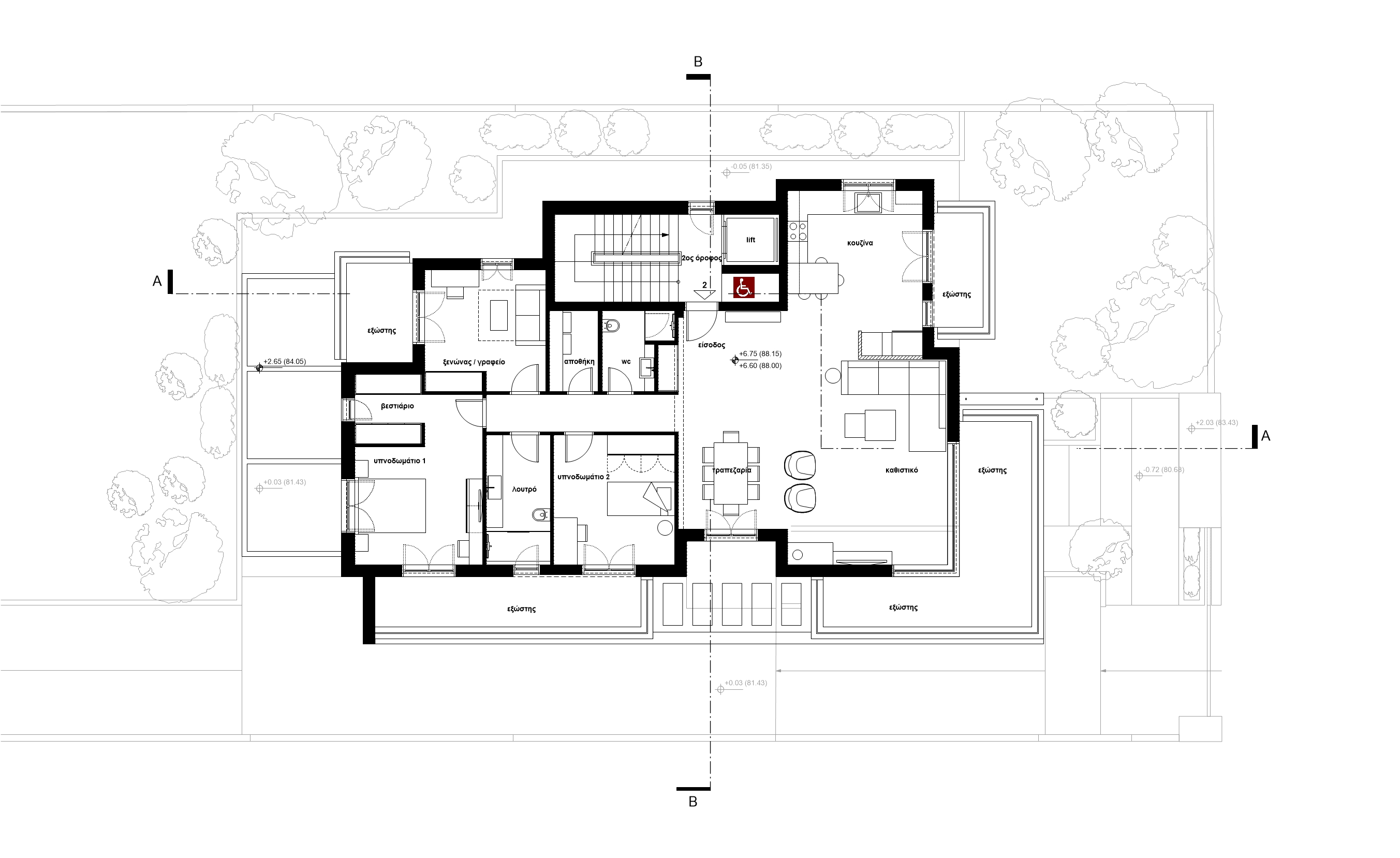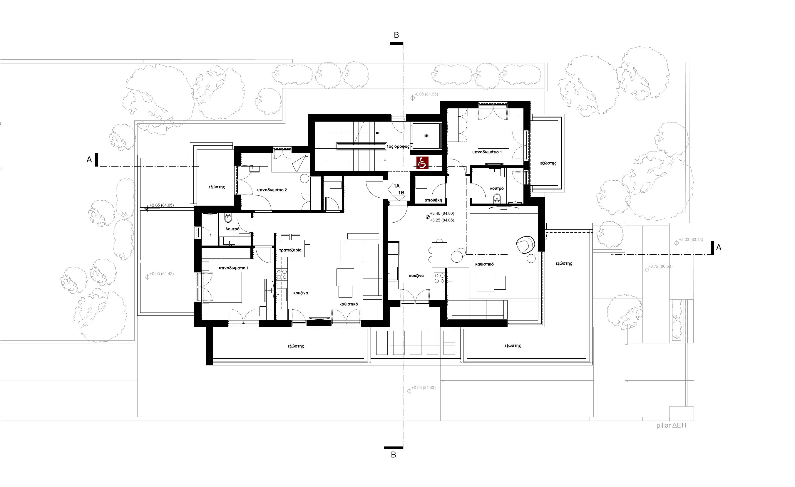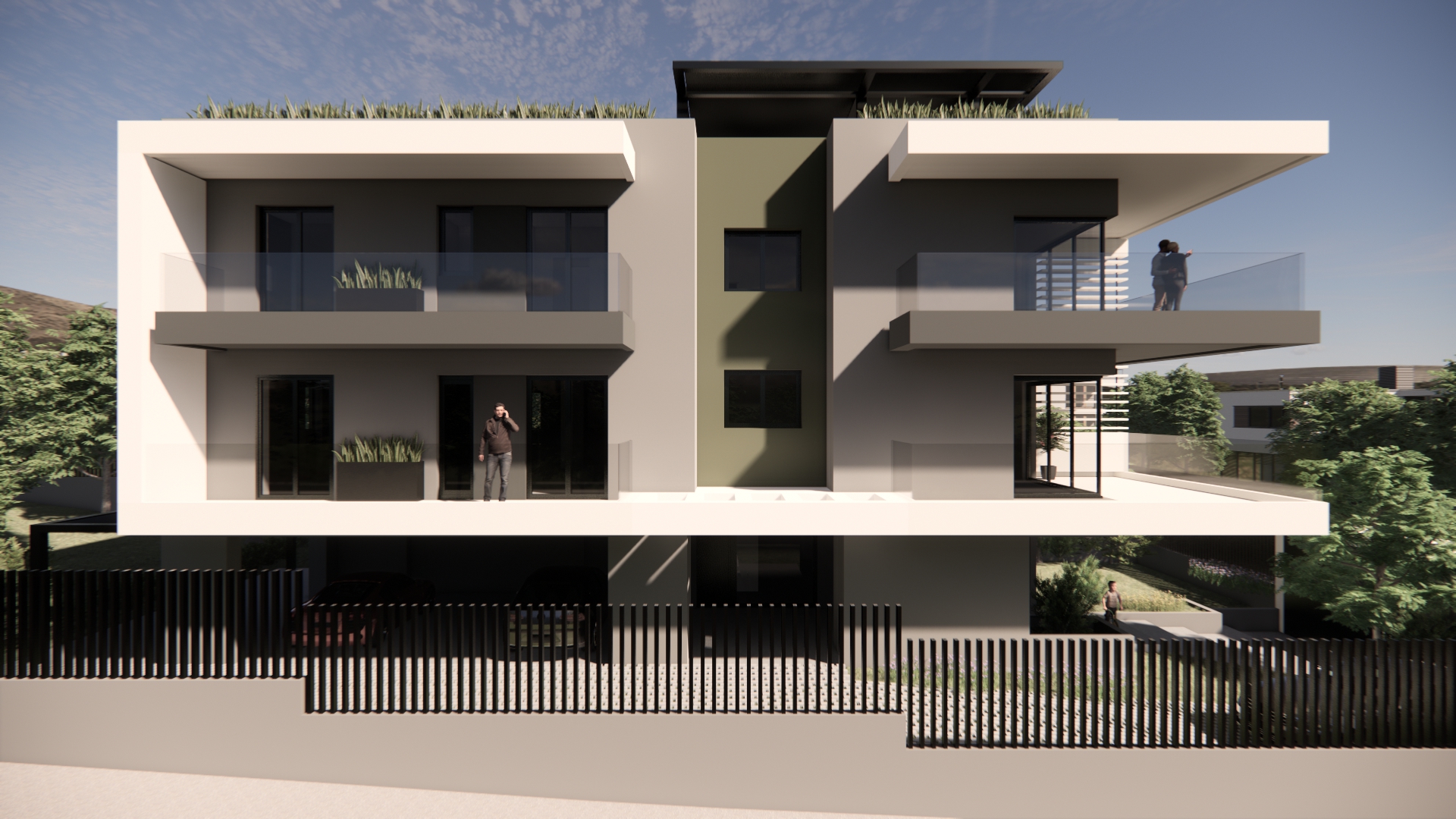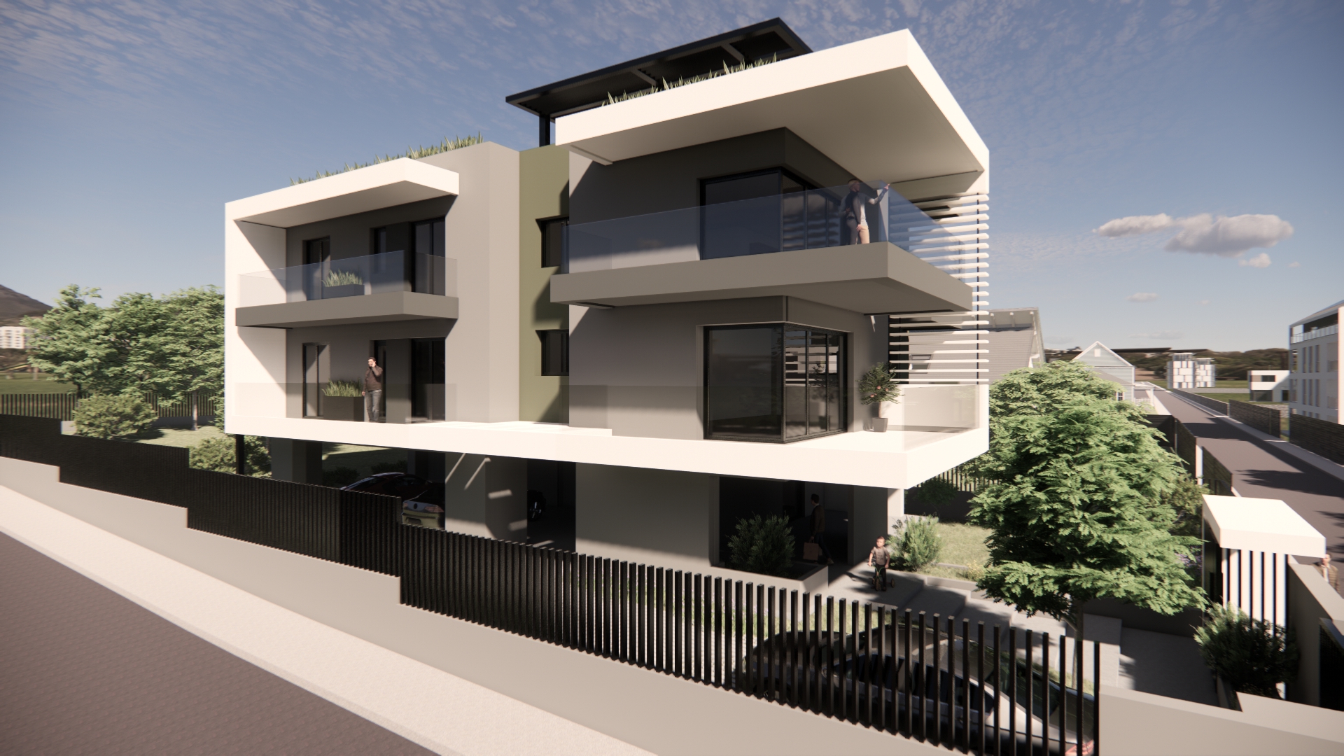 Το κτίριο τοποθετείται κεντρικά σε οικόπεδο εμβαδού 550 τ.μ. και αναπτύσσεται σε τρία επίπεδα. Το ισόγειο διαμορφώνεται ως pilotis με την κεντρική είσοδο και χώρους στάθμευσης οχημάτων. Στον πρώτο και δεύτερο όροφο χωροθετούνται συνολικά τρία διαμερίσματα. Στον πρώτο όροφο βρίσκονται τα δύο διαμερίσματα με επιφάνειες περίπου 80.00 τ.μ. ενώ στο δεύτερο όροφο βρίσκεται ένα οροφοδιαμέρισμα συνολικής επιφάνειας περίπου 160.00 τ.μ. Το κοινόχρηστο κλιμακοστάσιο καταλήγει σε βατό δώμα του κτιρίου όπου κατασκευάζεται μεταλλική πέργκολα και διαμορφώνεται χώρος υπαίθριου καθιστικού με οπτική φυγή στη θέα του Ολύμπου.